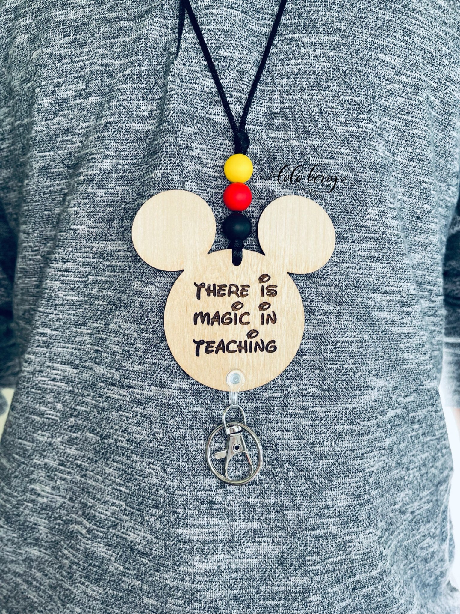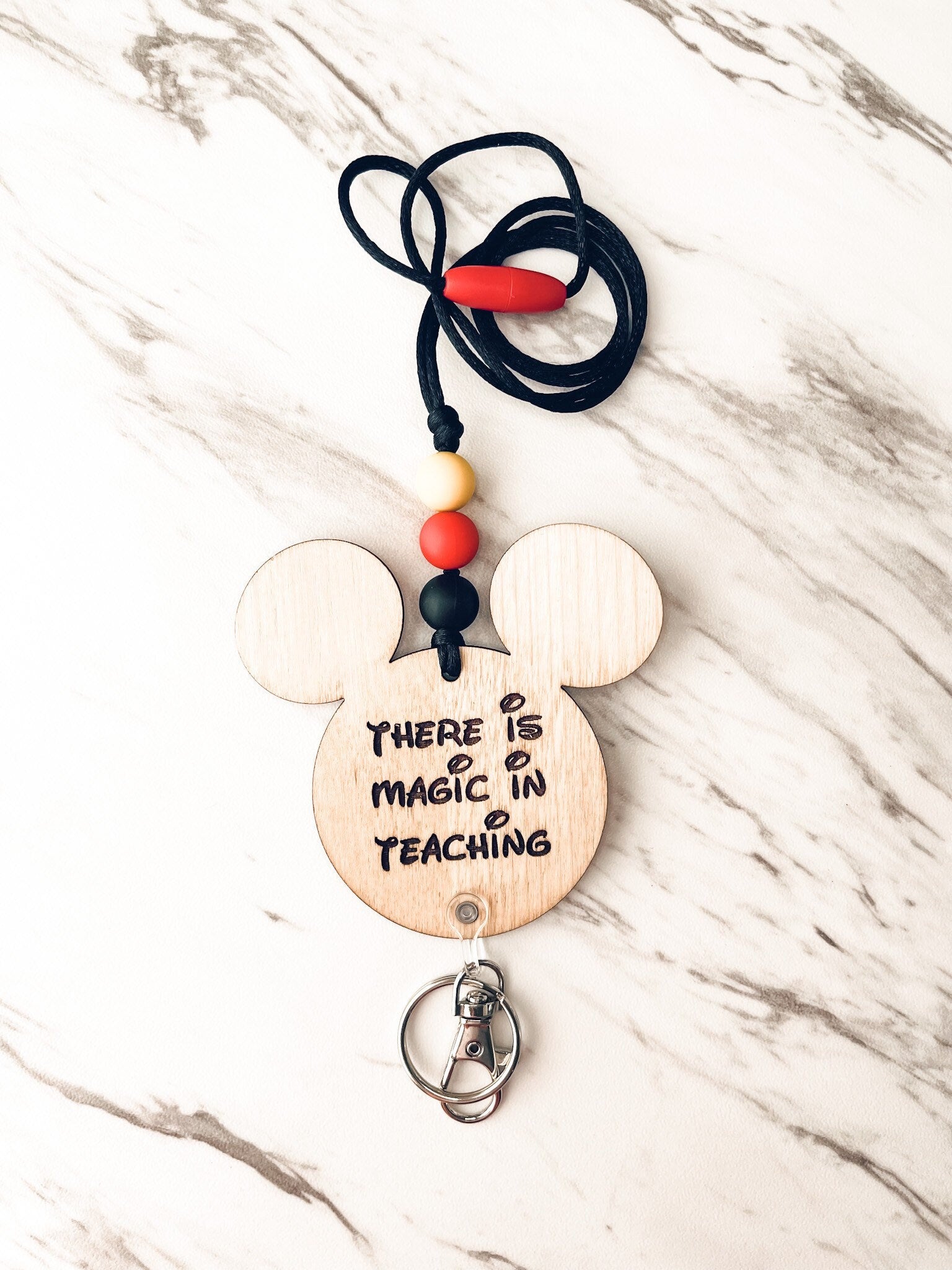 Engraved wooden lanyards with silicone beads and breakaway clasps bring some flair to identification tags anywhere. Perfect for work or school.